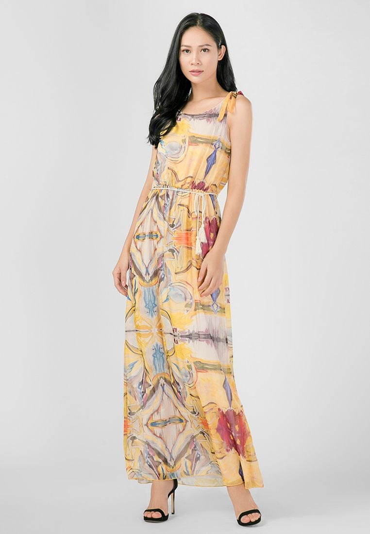 Đầm Maxi Hai Dây Thắt Nơ Hoạt Tiết Lá