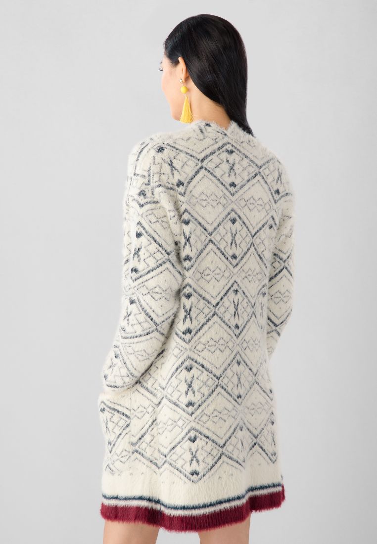 Áo khoác len dáng dài, họa tiết lạ mắt, màu sắc thời trang.