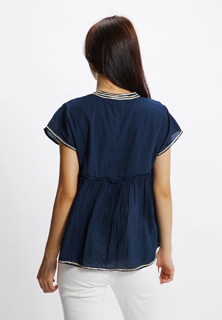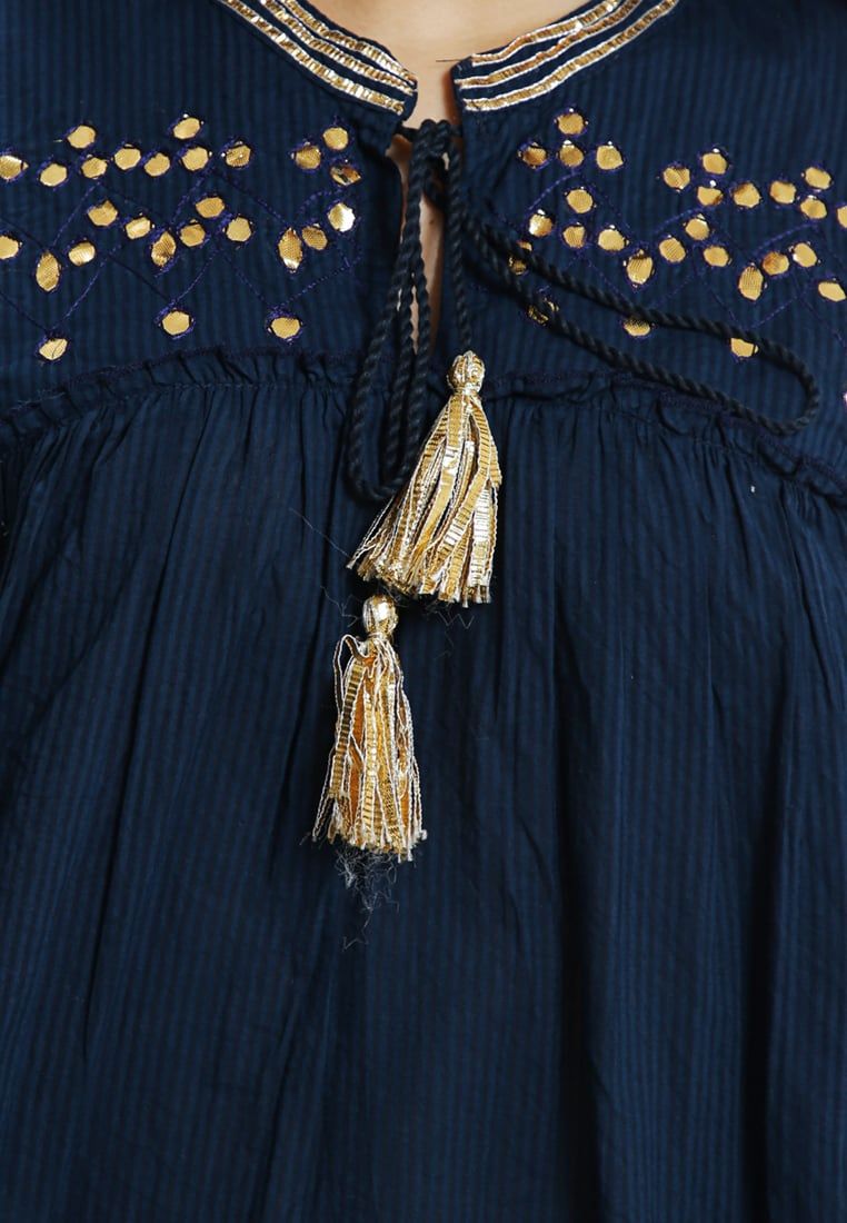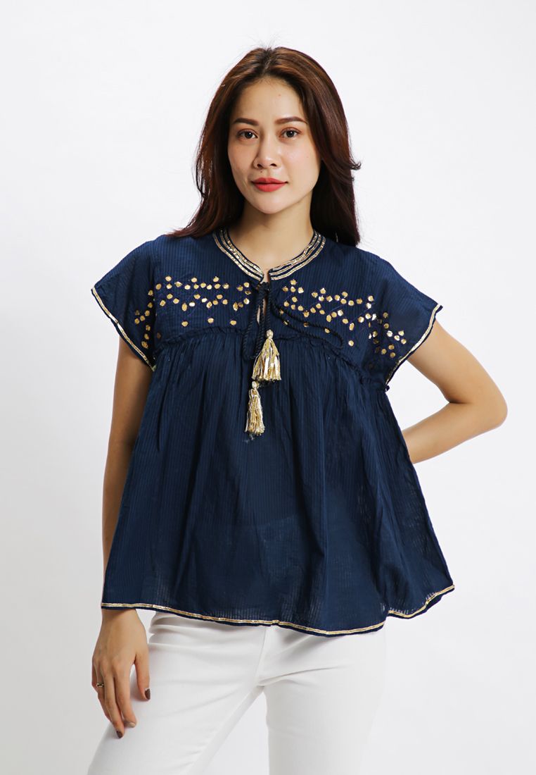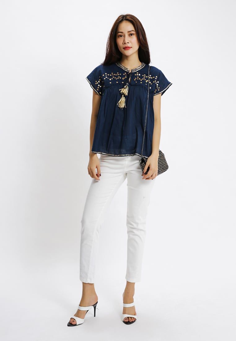 Điểm nhấn ánh kim nổi bật trước ngực, cổ áo, và tay áo