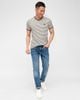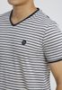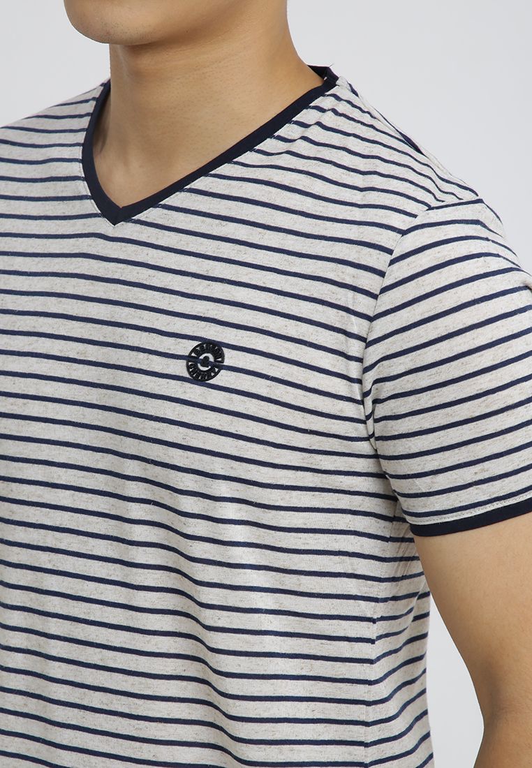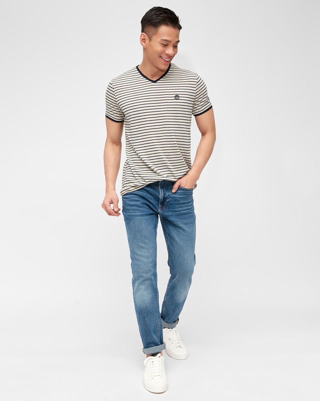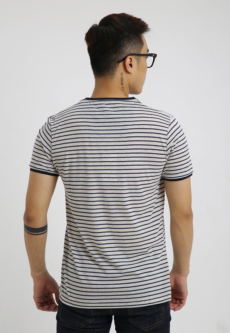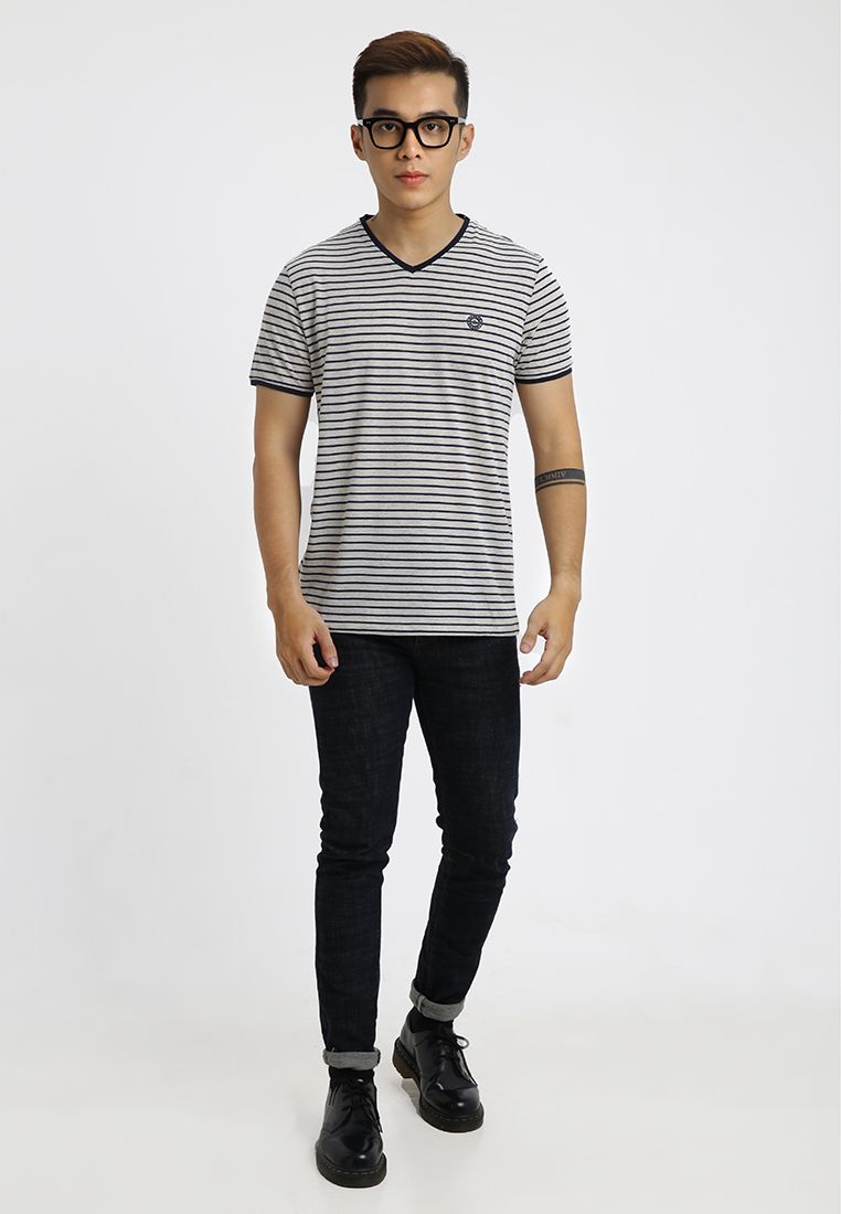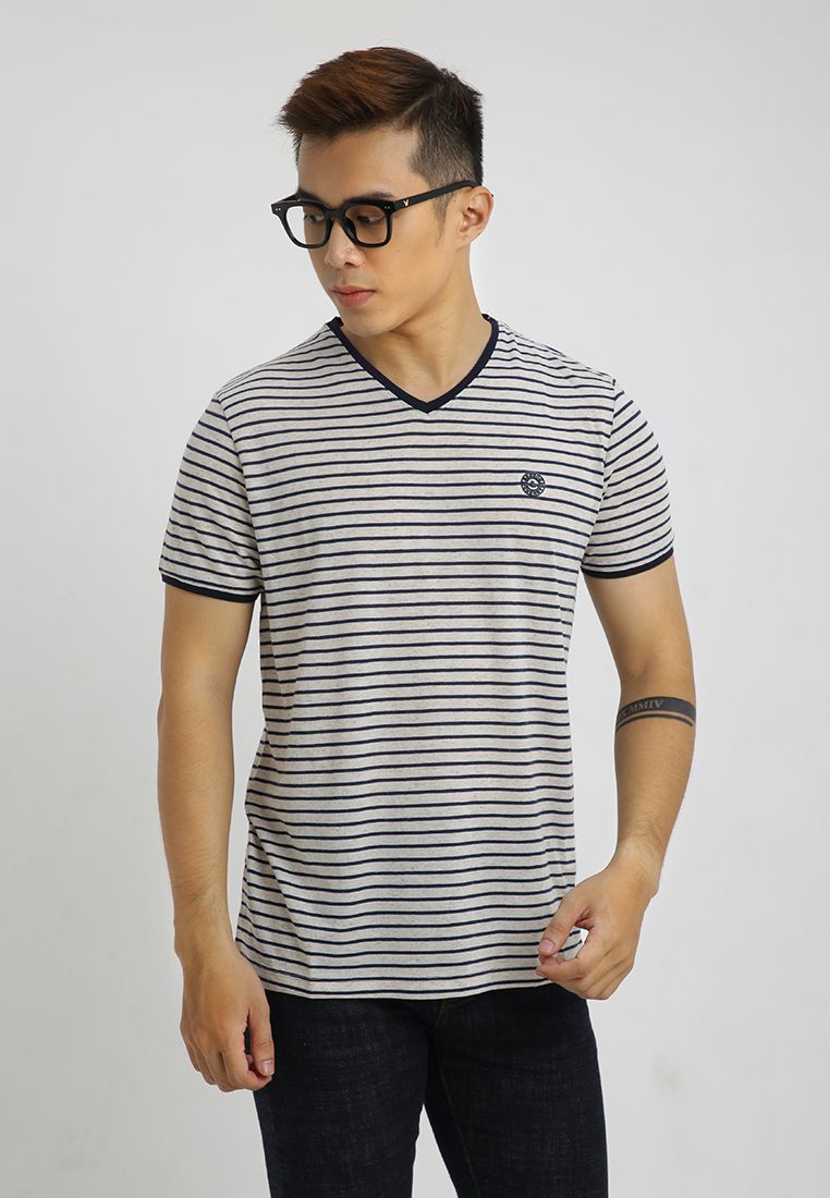 Áo thun nam tay ngắn, cổ tim, sọc ngang phối logo ngực.