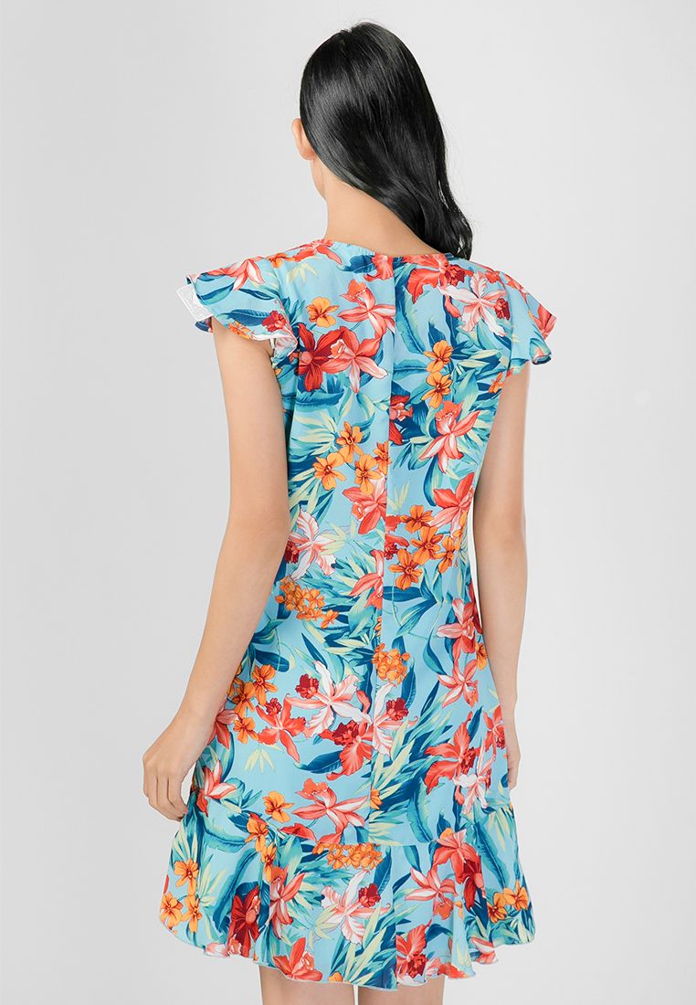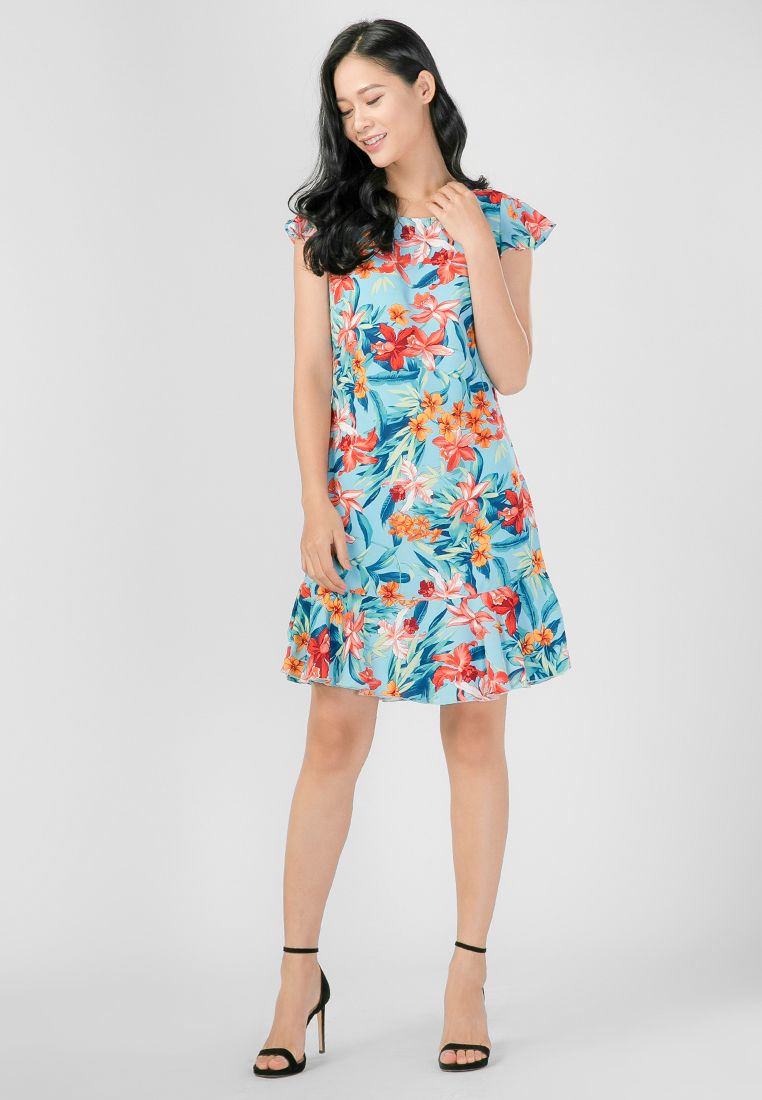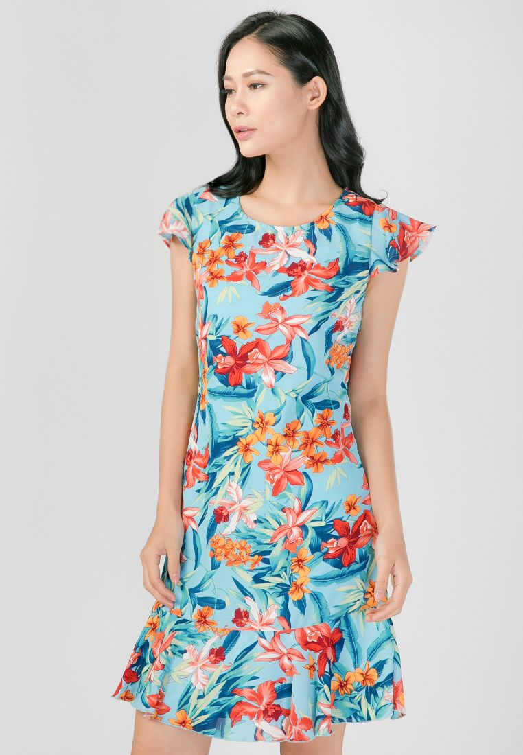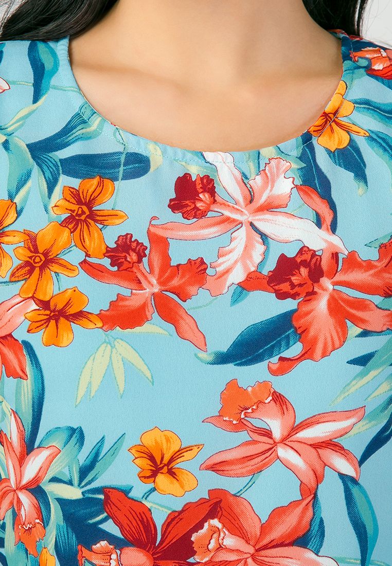 Đầm cổ tròn phối họa tiết hoa lan thanh lịch và nữ tính.