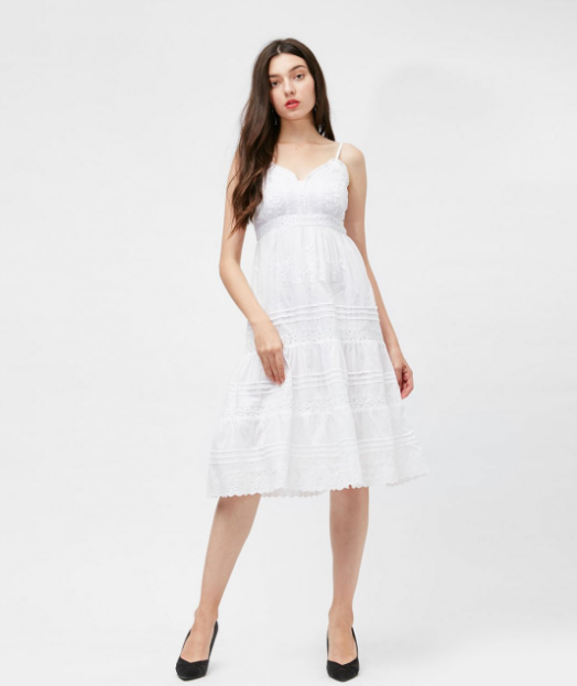 Đầm hai dây kết hợp họa tiết thêu nổi thanh lịch và nữ tính.
