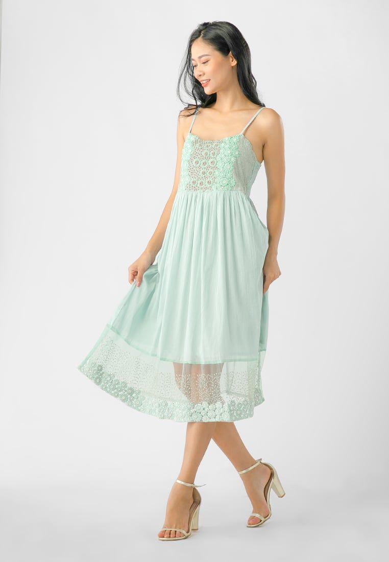 Đầm hai dây phối thêu hoa nổi bật trước ngực và chân đầm thanh lịch và nữ tính.