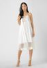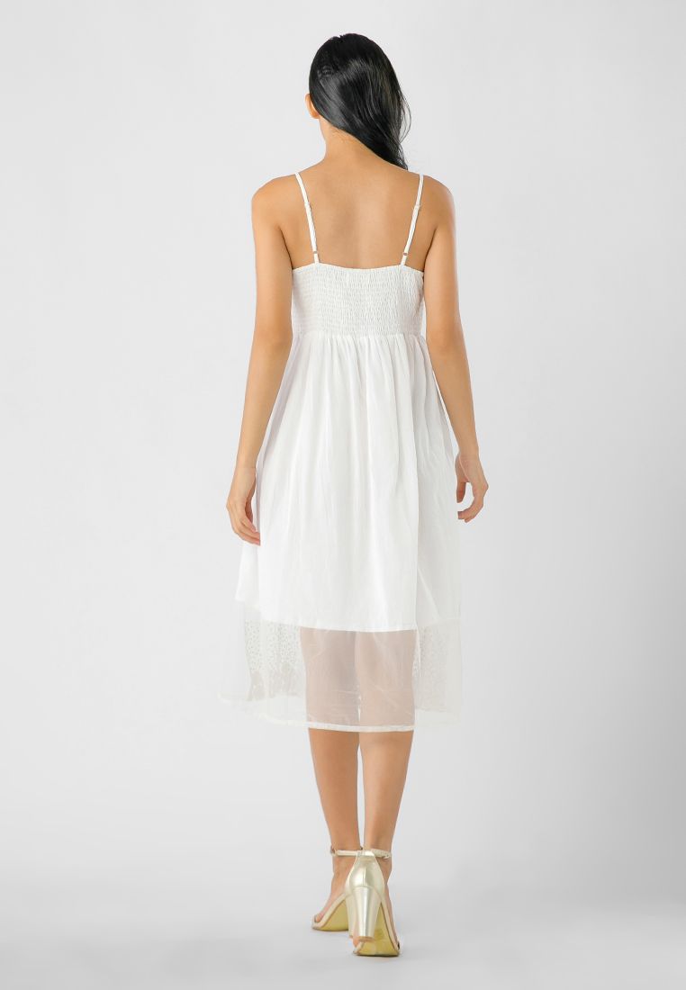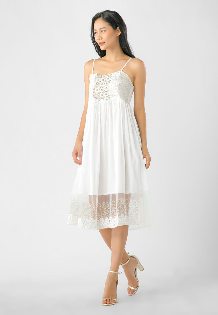Đầm hai dây phối thêu hoa nổi bật trước ngực và chân đầm thanh lịch và nữ tính.