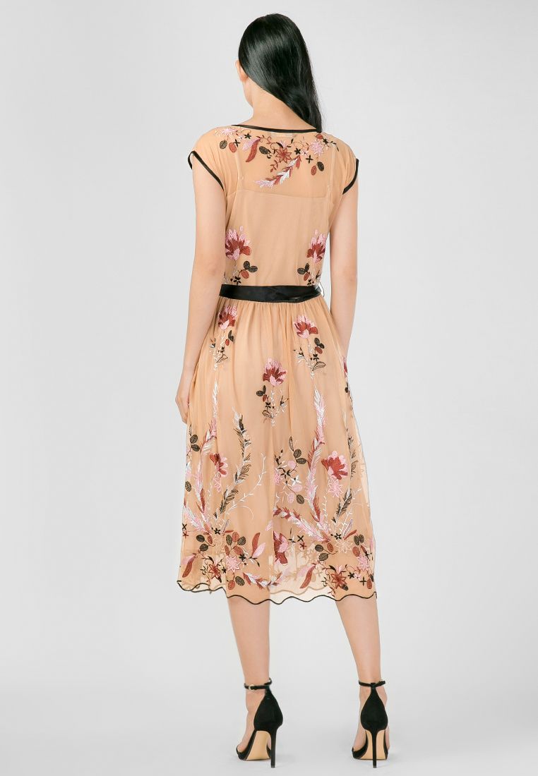 Đầm họa tiết thêu hoa phối viền đen gợn sóng sang trọng và nữ tính.
