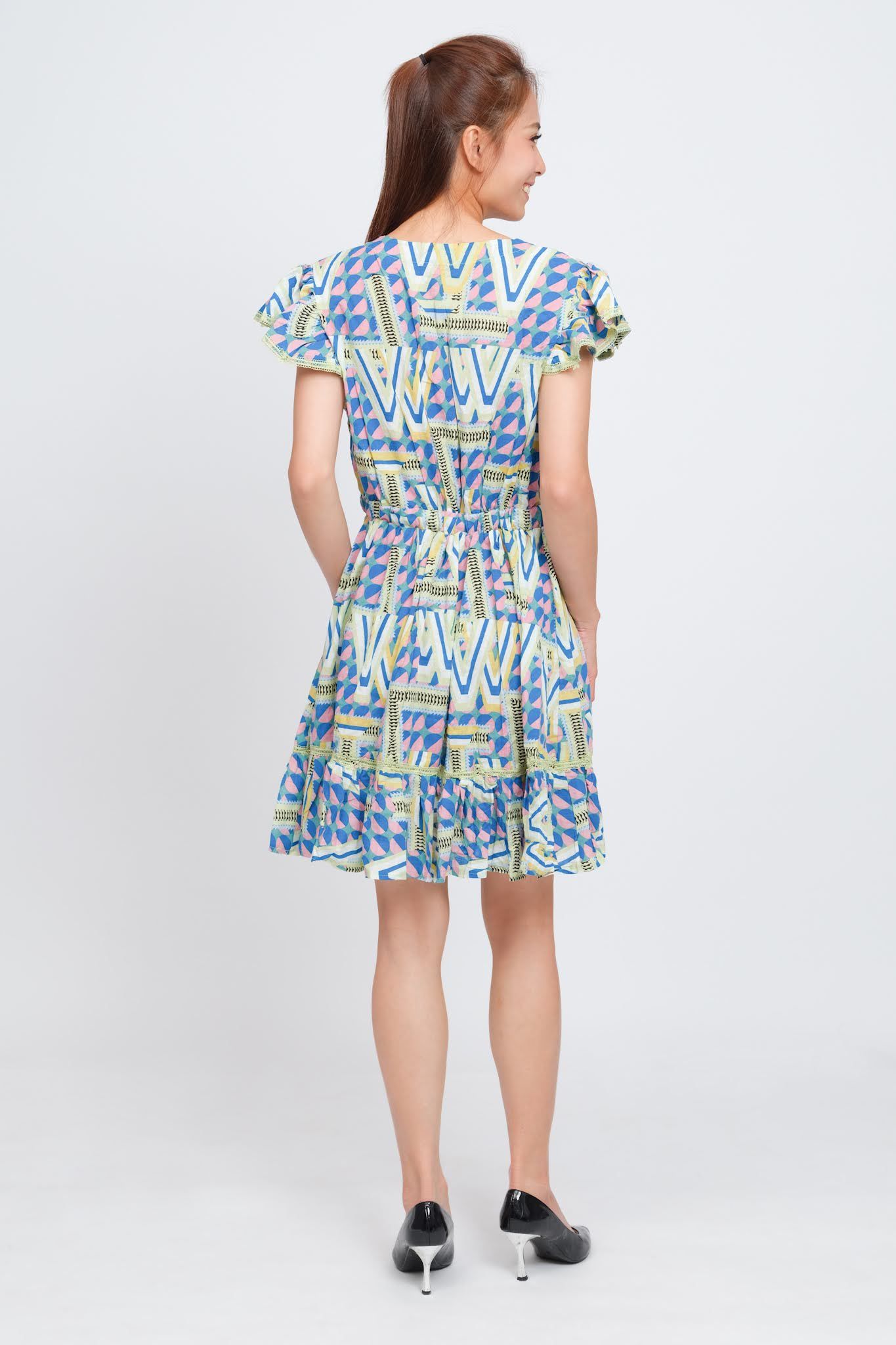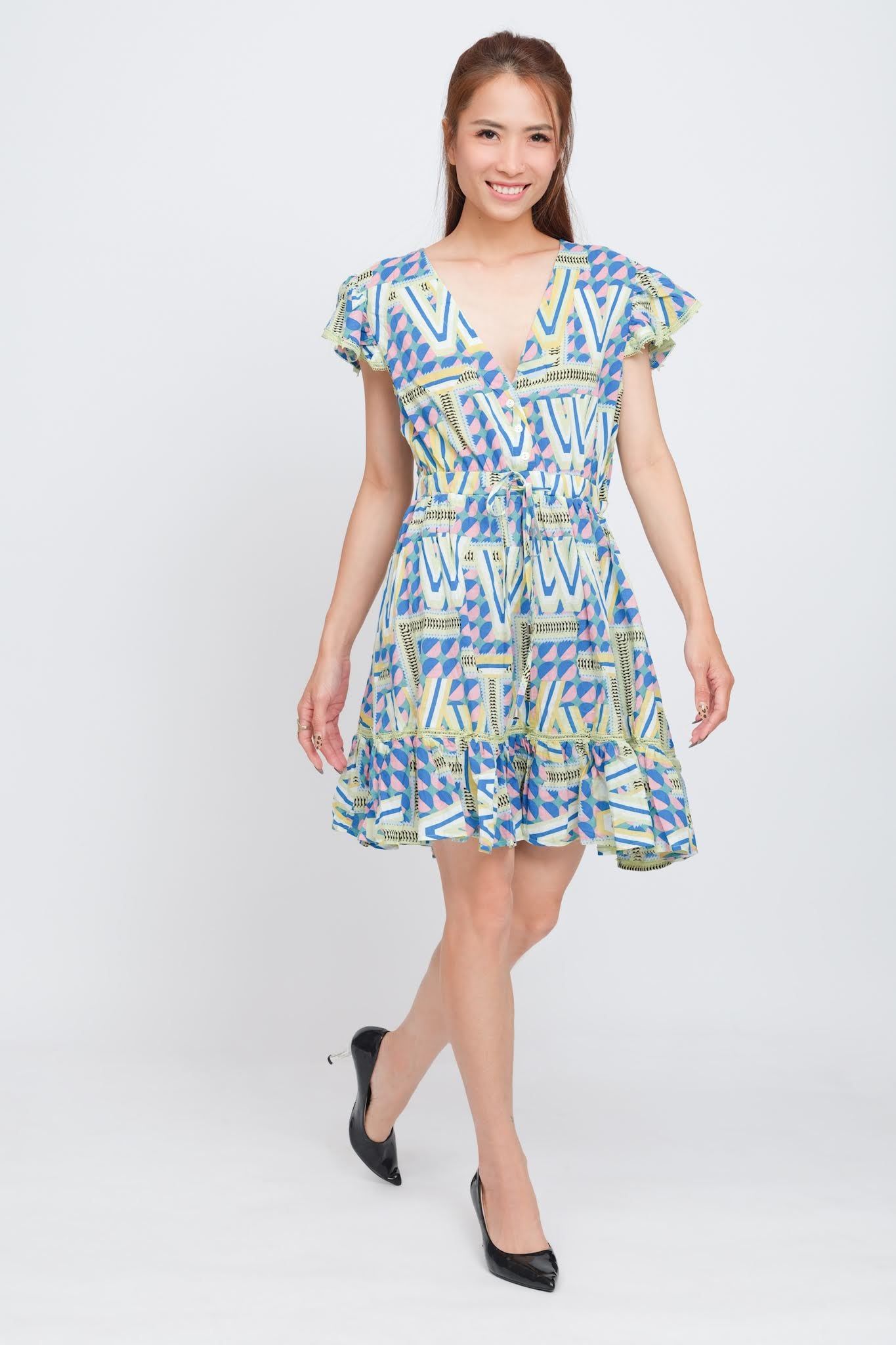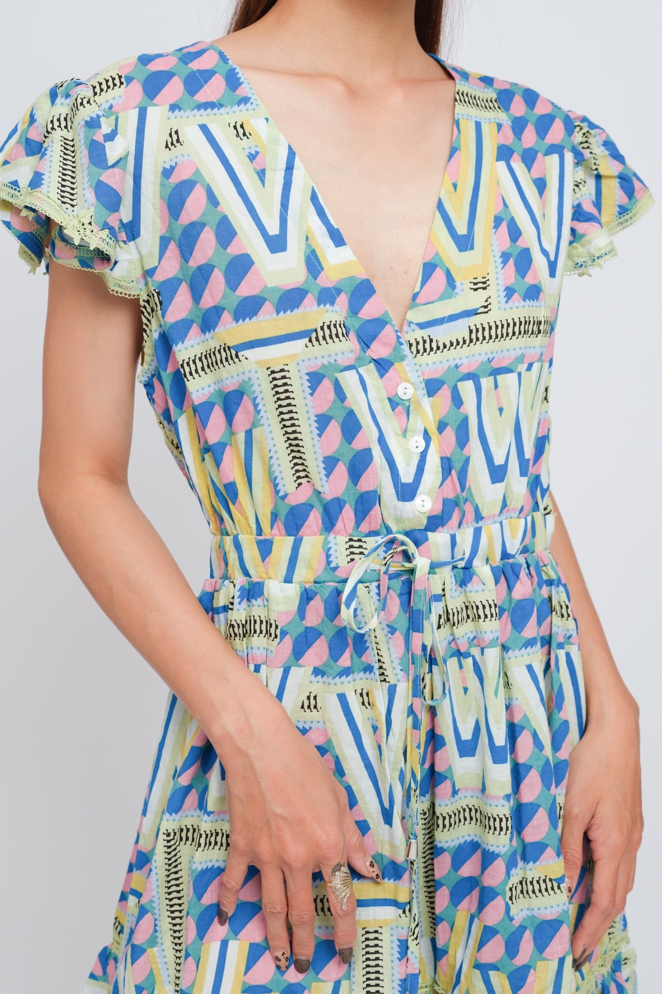 Phối ren trên thân đầm, có dây rút ở eo