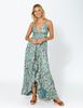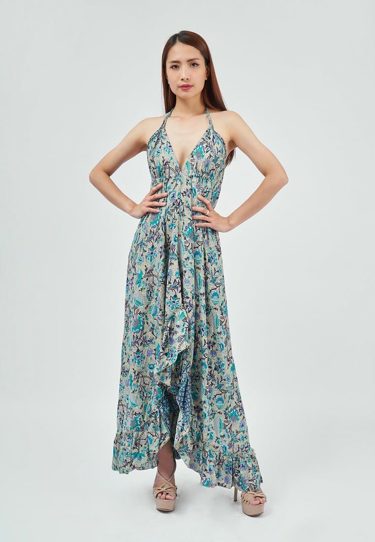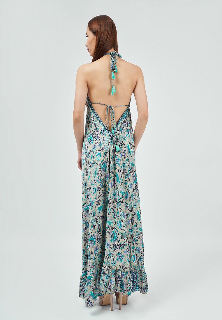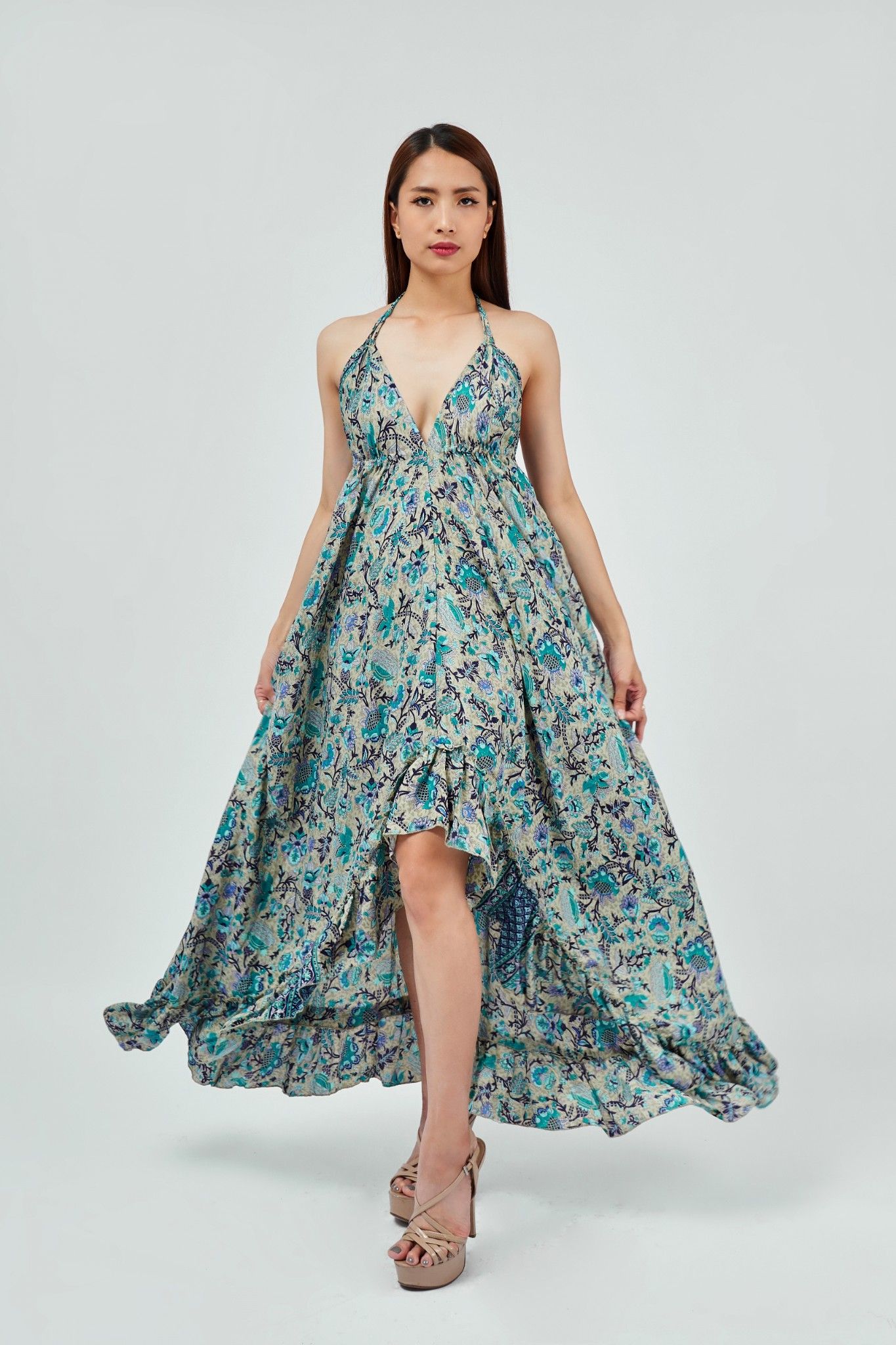 Họa tiết độc đáo, với thiết kế cổ yếm và phần khoét lưng sâu quyến rũ.