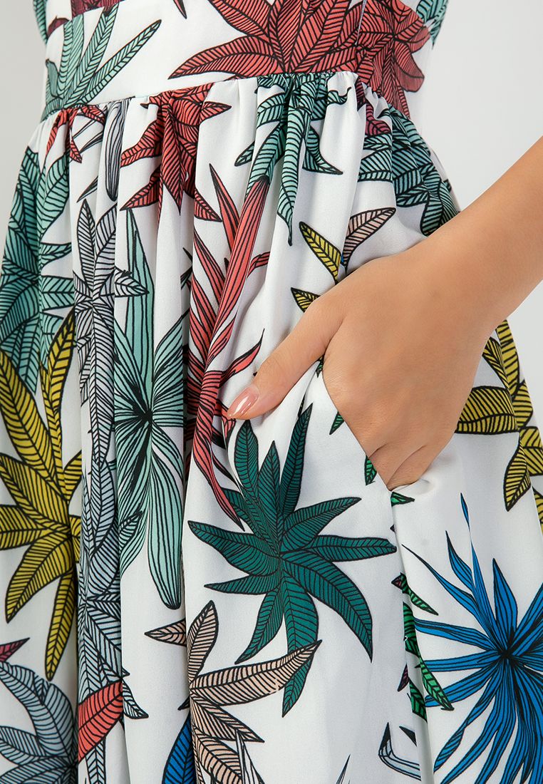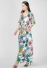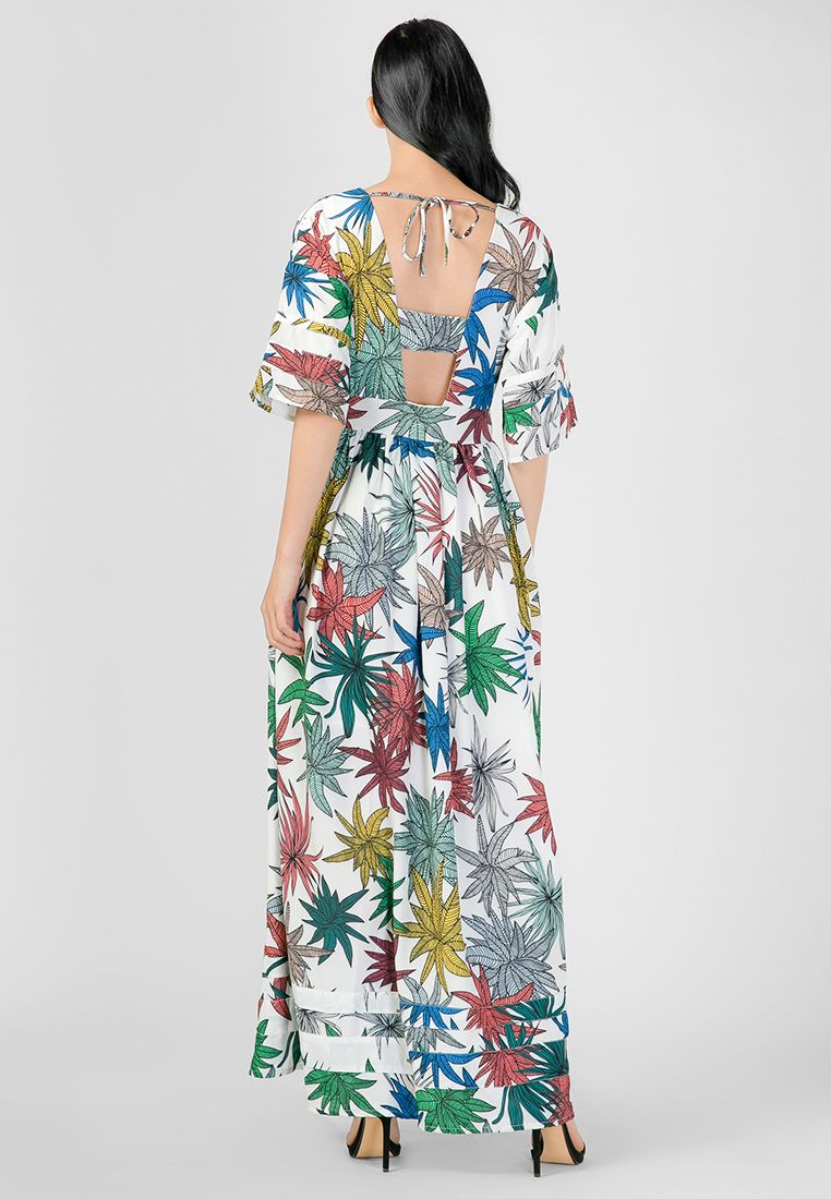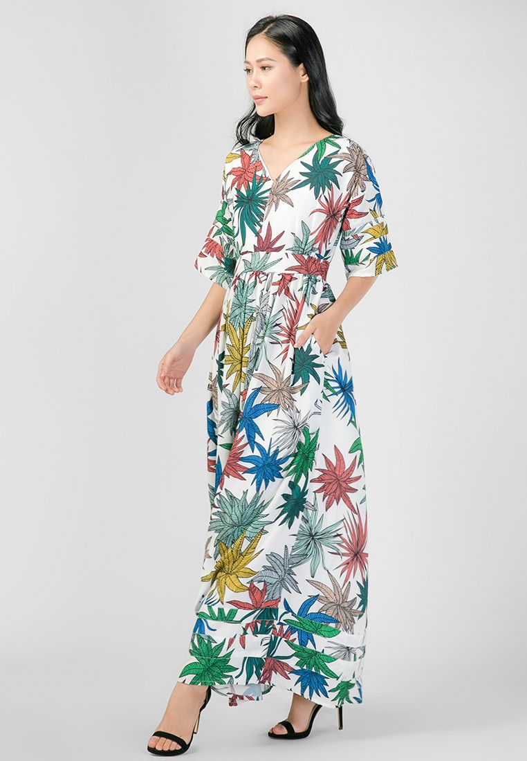 Đầm maxi họa tiết hoa lá kết hợp màu sắc tươi sáng mang lại phong cách sang trọng và nữ tính.