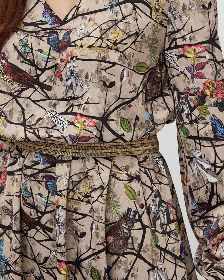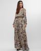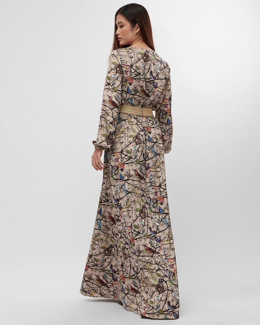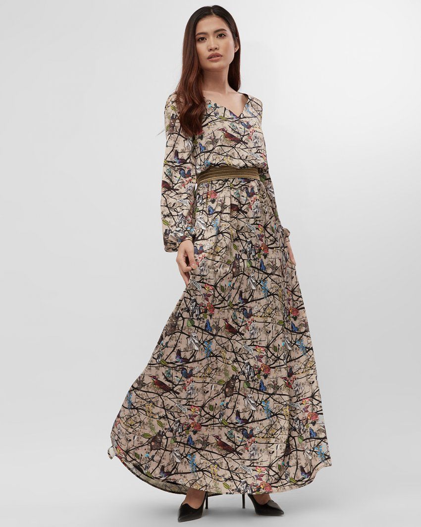 Đầm maxi họa tiết lạ mắt kết hợp màu sắc tươi sáng mang lại phong cách sang trọng và nữ tính.