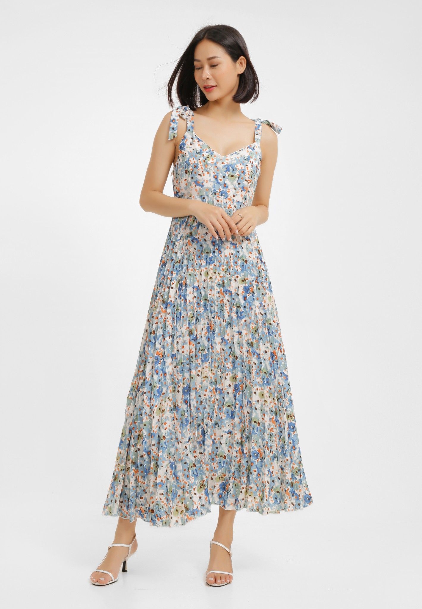 Đầm maxi hai dây xếp li phối họa tiết hoa sang trọng và nữ tính