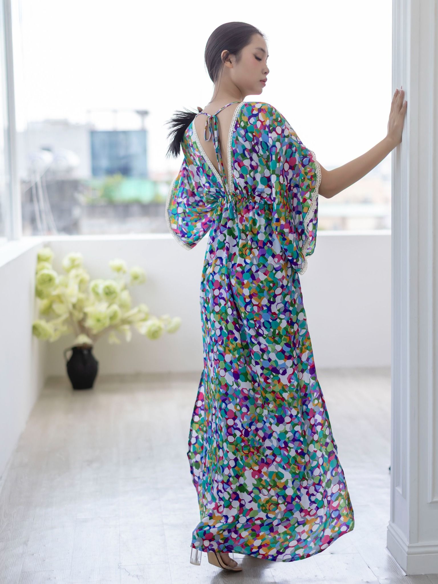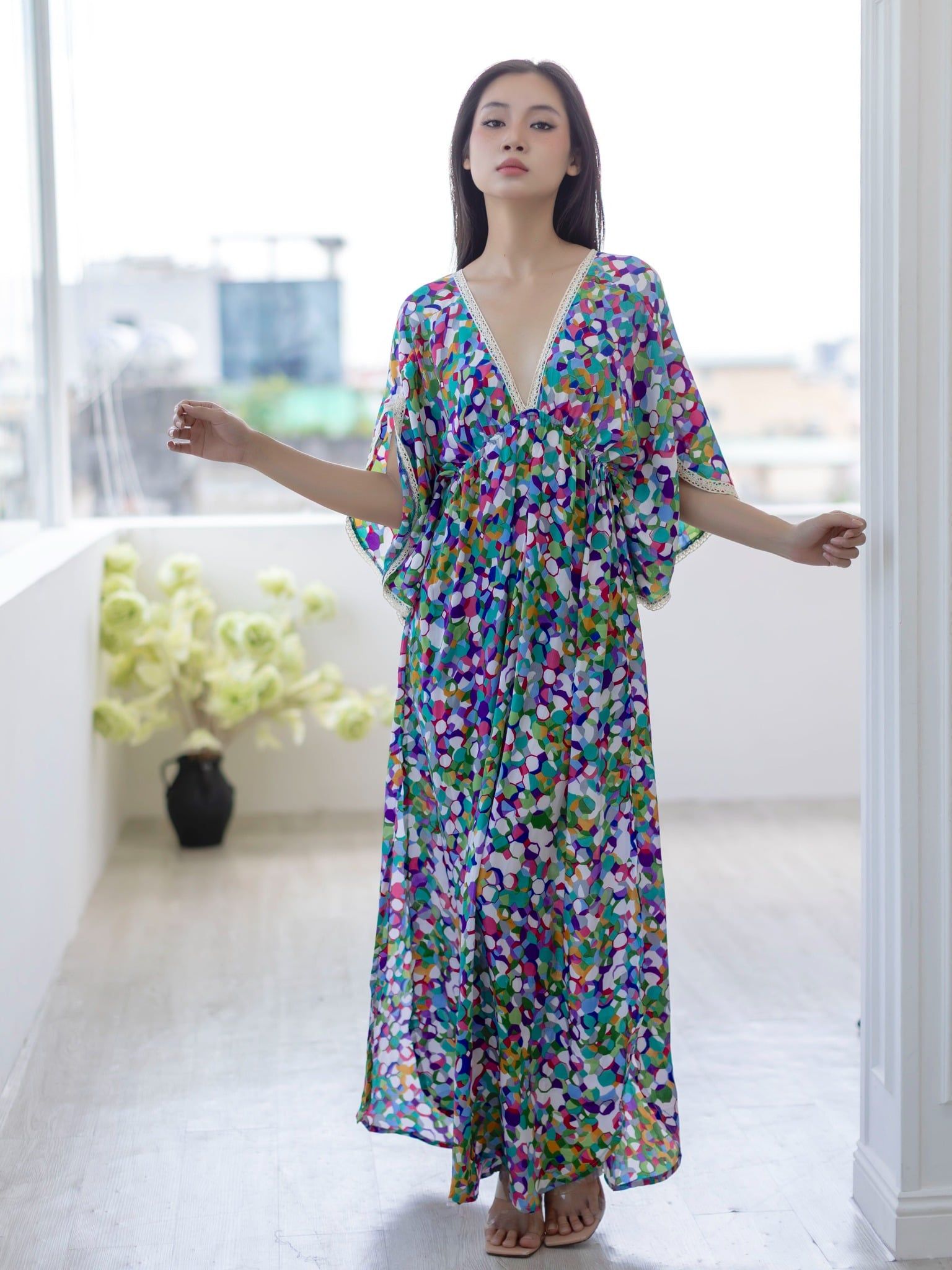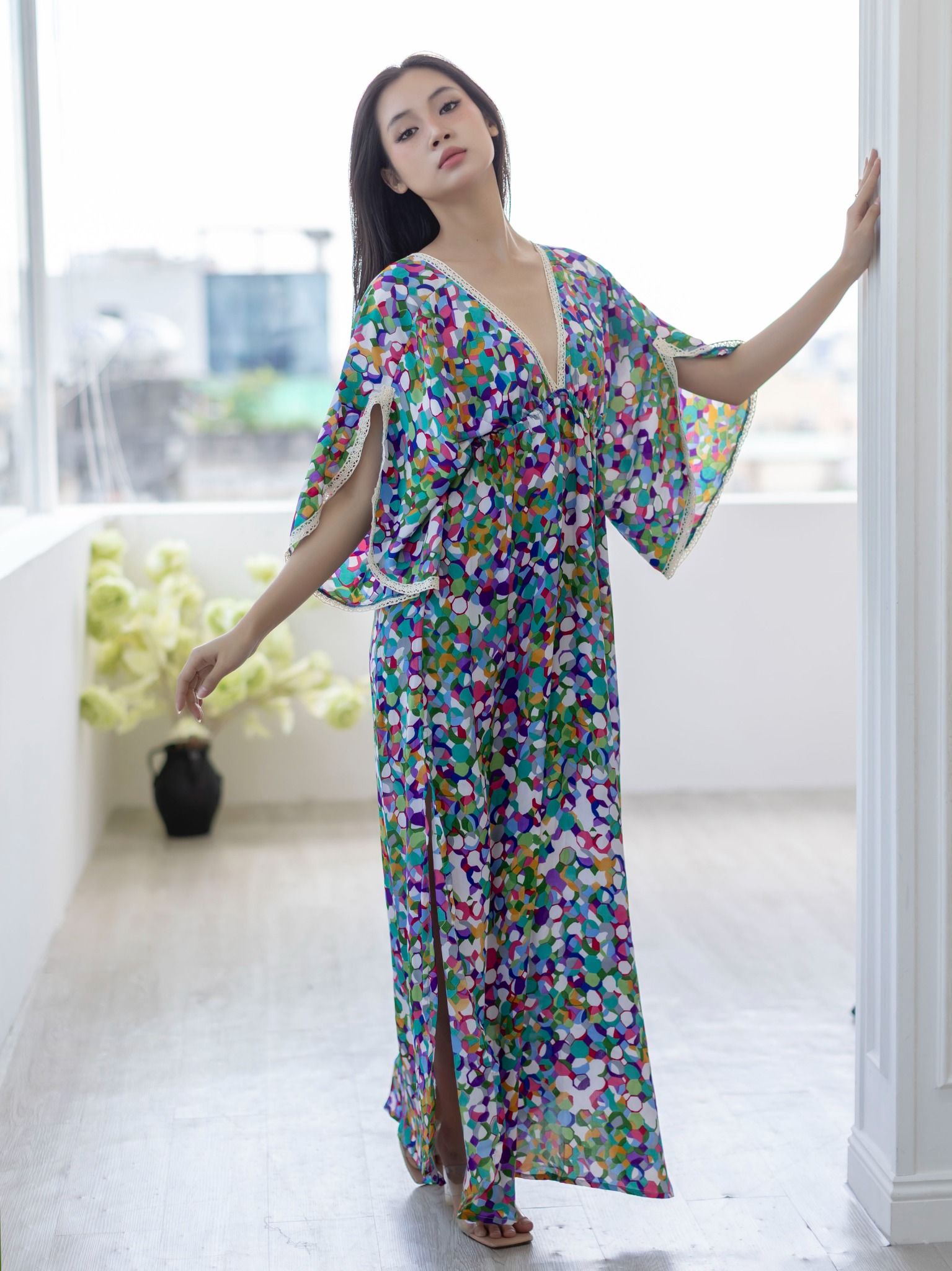 Maxi cánh dơi chất vải lụa pha cao cấp mềm mại thoáng mát. Phom suông rộng. Dây nơ cột sau lưng có thể tăng giảm, thun eo co giãn như freesize. Phom suông. Dài đầm 135cm ( 60x 135cm)