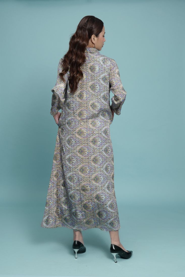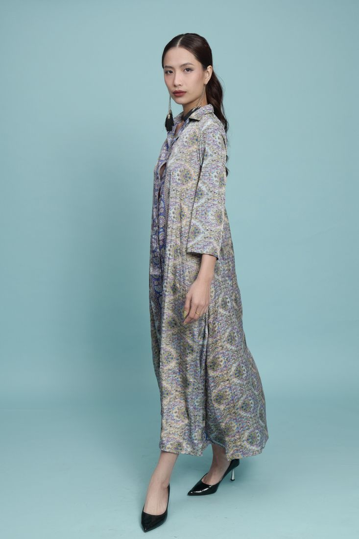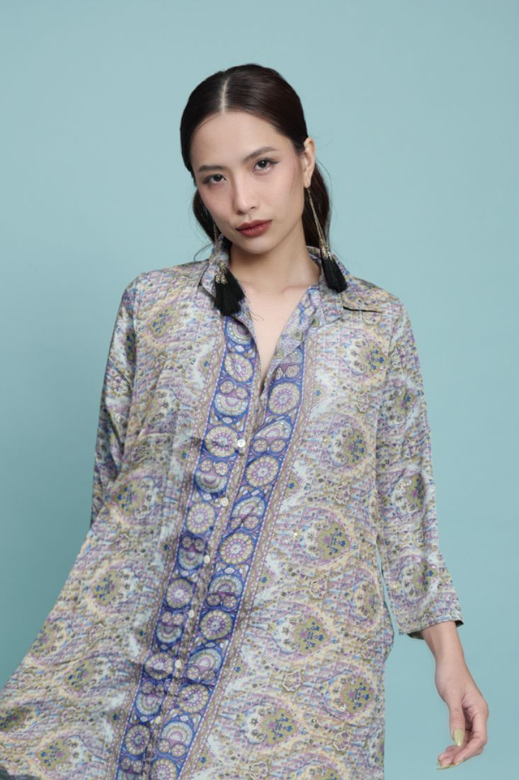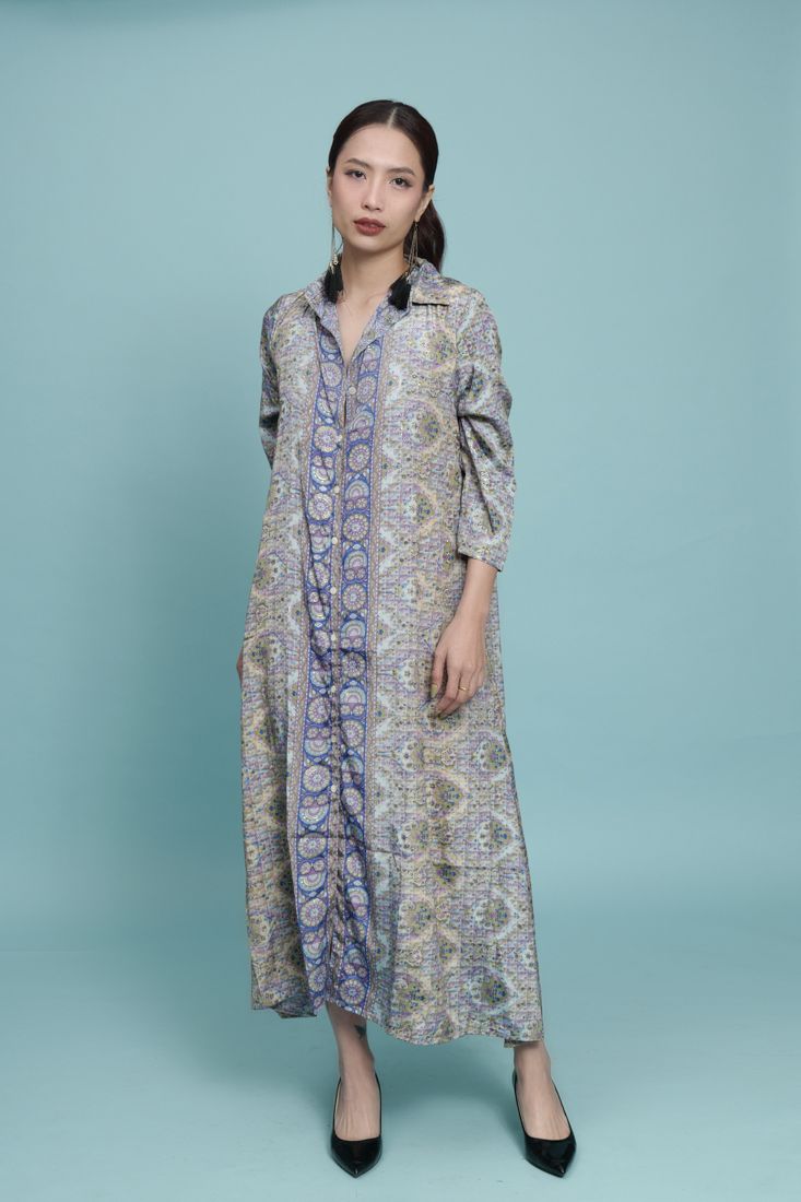 Maxi sơ mi chất liệu lụa pha cao cấp, mềm mại, hoạ tiết thổ cẩm. Phom suông rộng chữ A. Dài đầm 125cm (47x125).