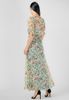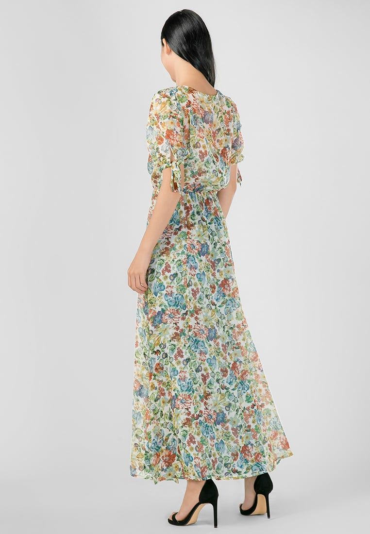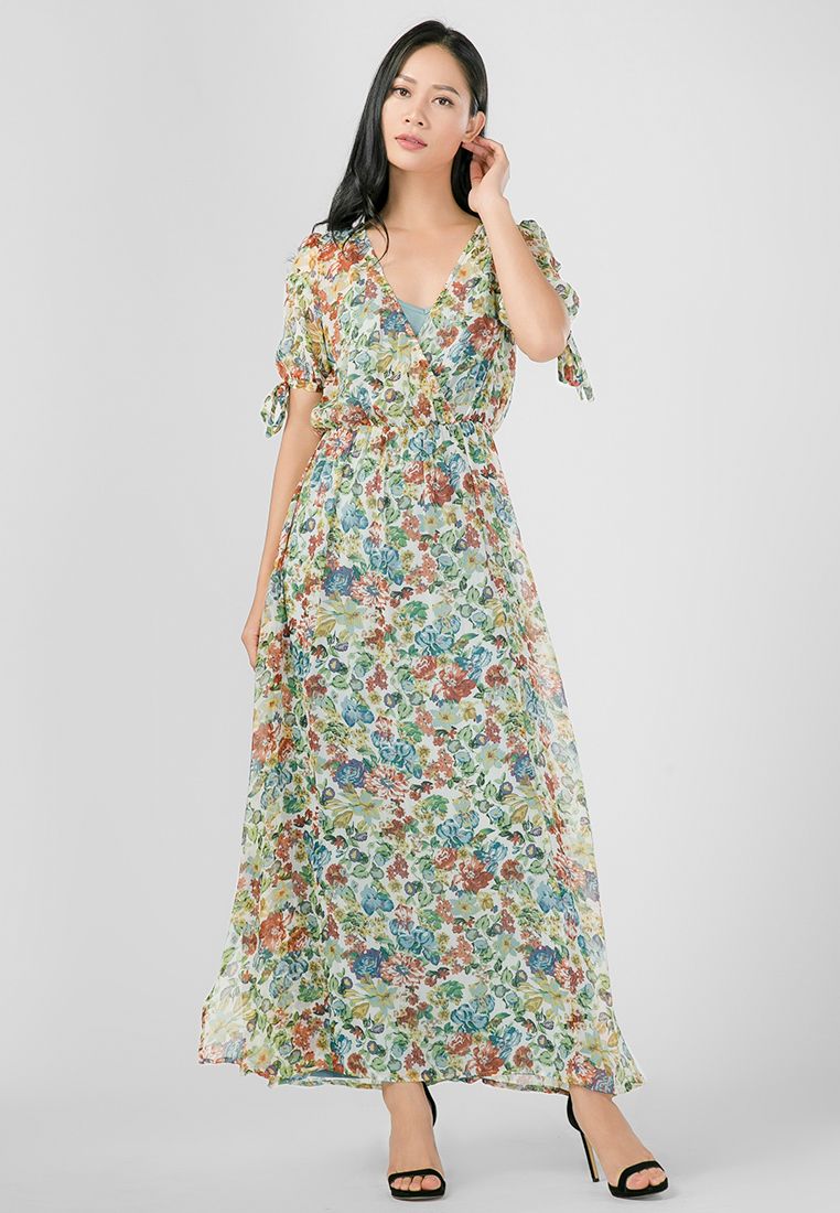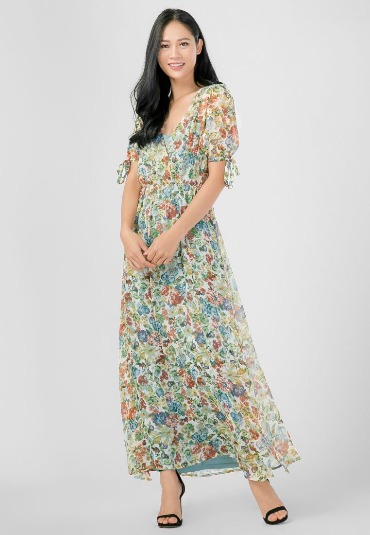 Đầm Maxi xẻ tà phối tay cột nơ họa tiết hoa lá nữ tính và thời trang.