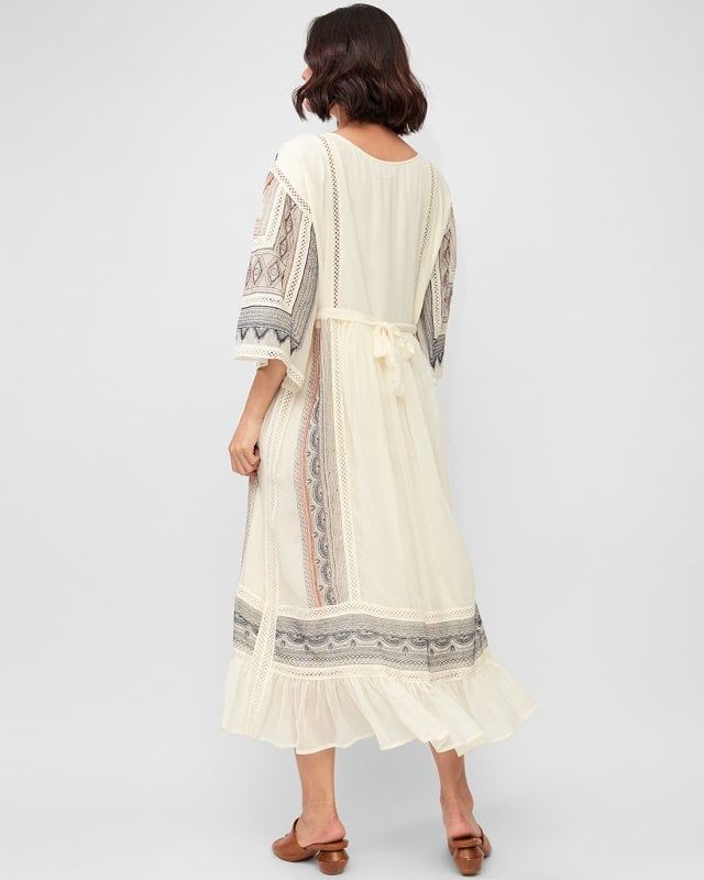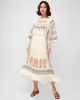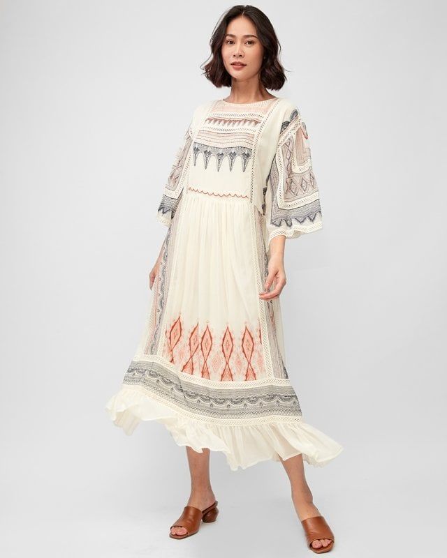 Điểm nhấn họa tiết thêu nổi kết hợp tay xòe rộng tạo sự sang trọng và nữ tính.