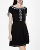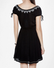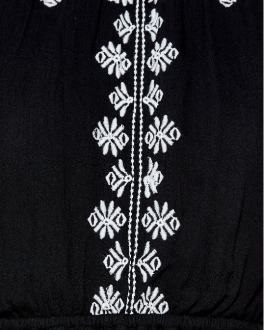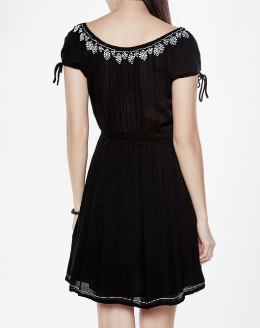 Đầm Nhúng Eo Đen kiểu dáng đơn giản, viền thêu quanh cổ tạo nên sự nữ tính cho thiết kế.