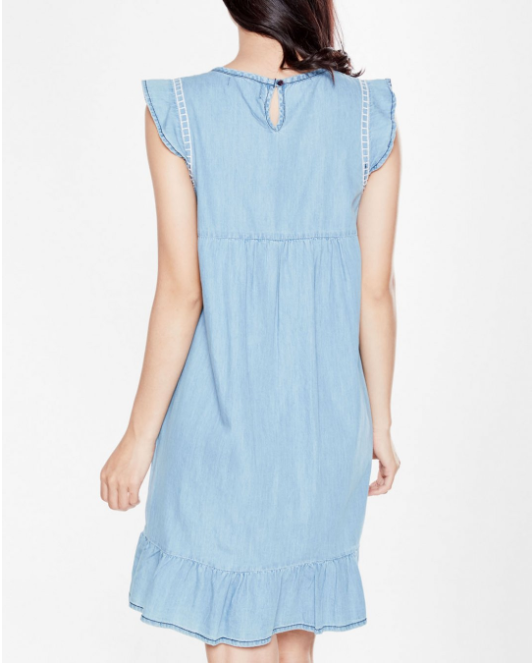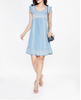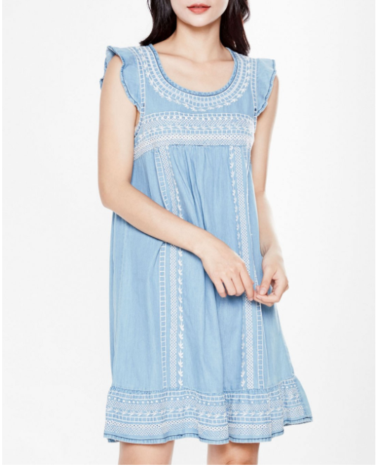 Đầm demin cổ tròn phối ren nữ tính, màu sắc thời trang.