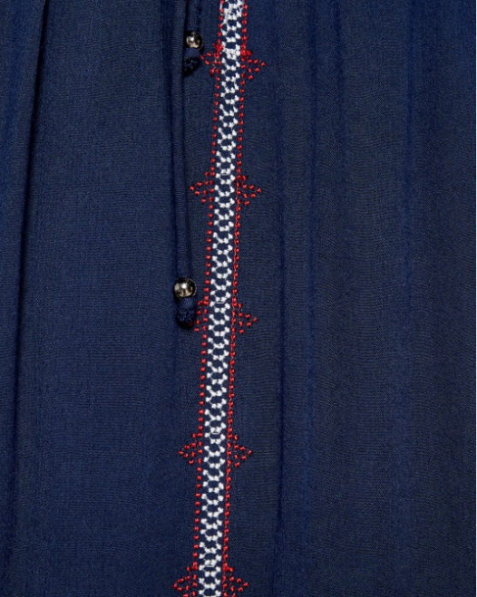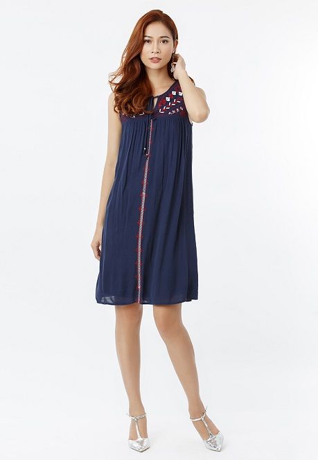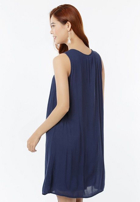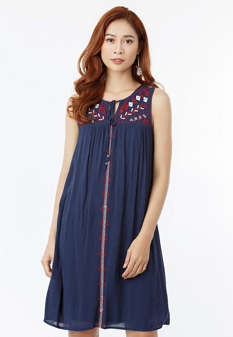 Đầm Sát Nách Boho Xanh form chữ A đơn giản kết hợp cùng họa tiết hình học thêu ở ngực áo tạo sự nữ tính, sang trọng.