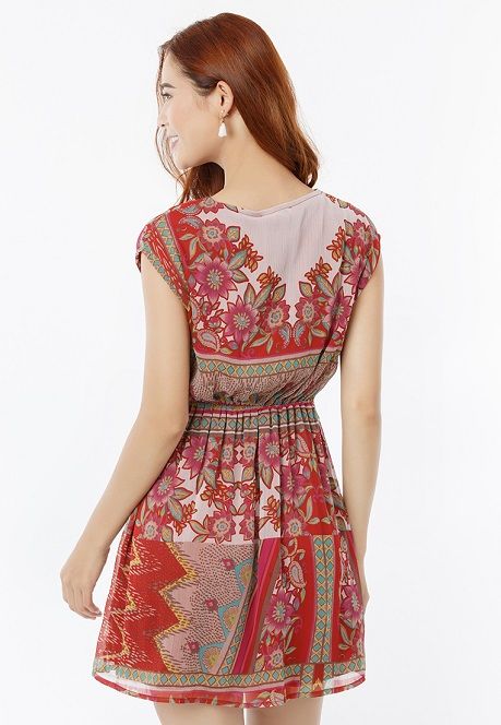 Đầm Sát Nách Cổ Tim form xòe đơn giản, màu sắc tươi sáng kết hợp cùng họa tiết hoa lá vừa năng động lại nữ tính.