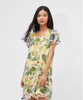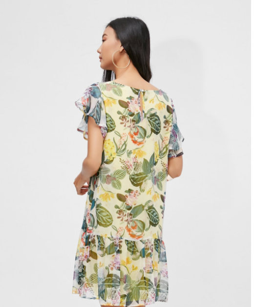 Đầm suông tay bèo họa tiết hoa lá chân đầm nữ tính.