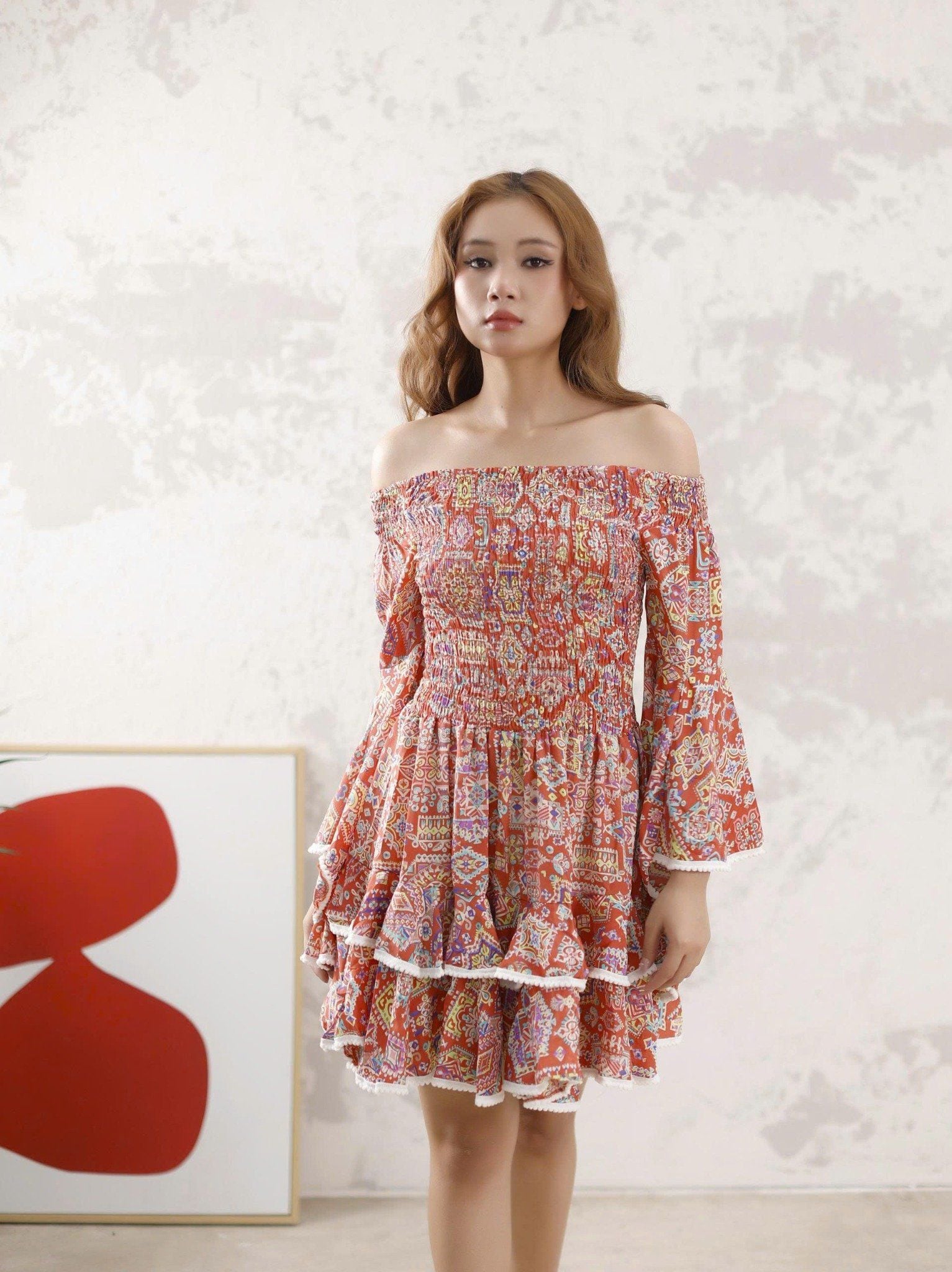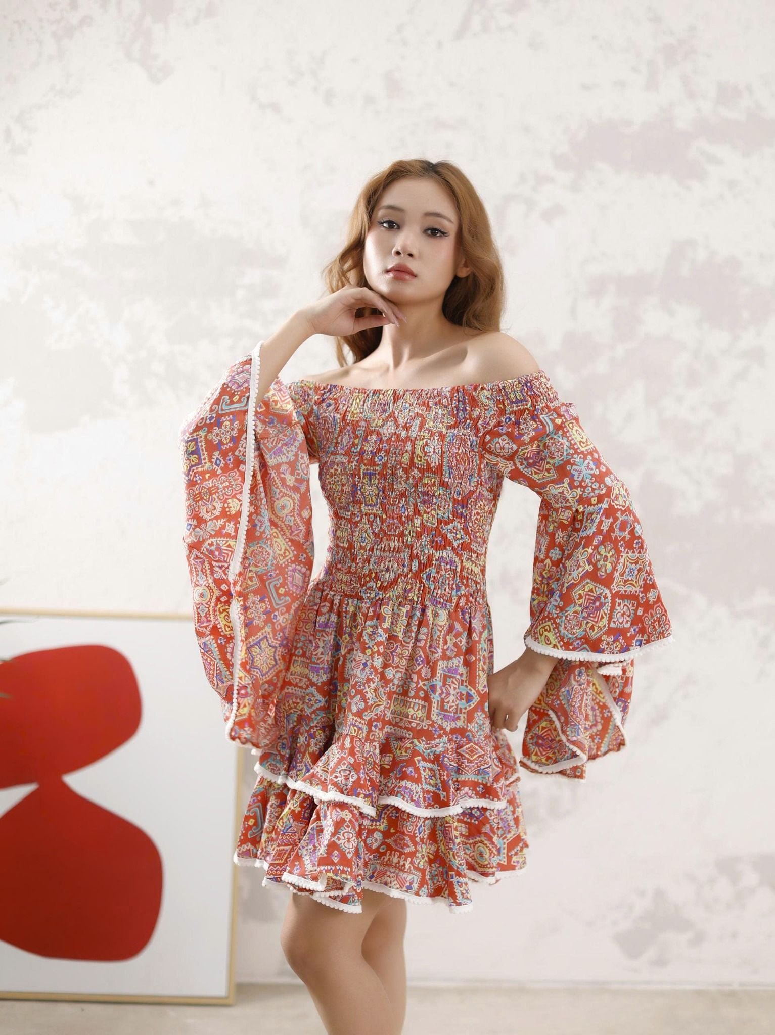 Đầm trễ vai lụa chất liệu lụa pha cao cấp, mềm mại, tay loe. Có thể mặc trễ vai hoặc kín vai. Phần thân trên có thun co giãn nhiều như freesize, ôm ngực tôn dáng. Phom vừa. Dài đầm 85cm (45cmx 85cm). Kéo trễ vai sẽ tạo độ dài thêm khoảng 10cm