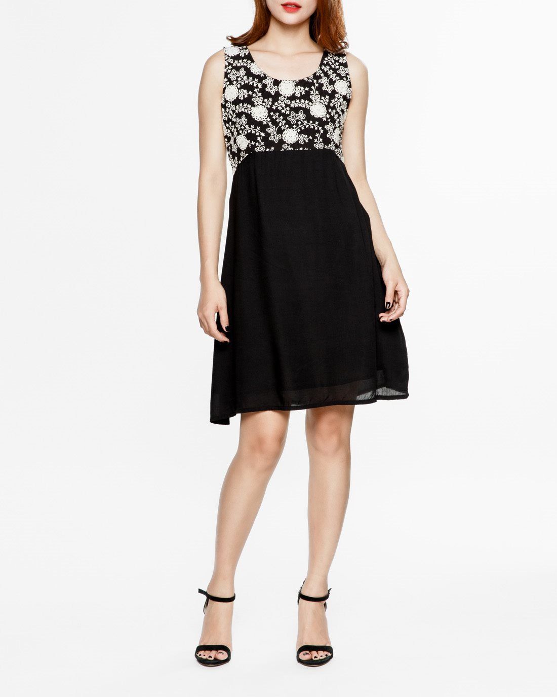 Đầm xòe không tay họa tiết hoa cách điệu được thêu trên phần thân trên của đầm, trang nhã, sang trọng nhưng không kém phần thanh lịch.