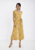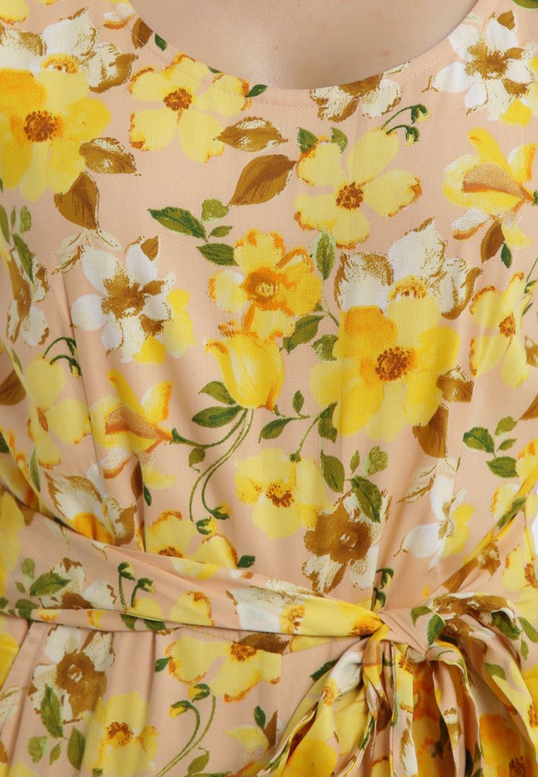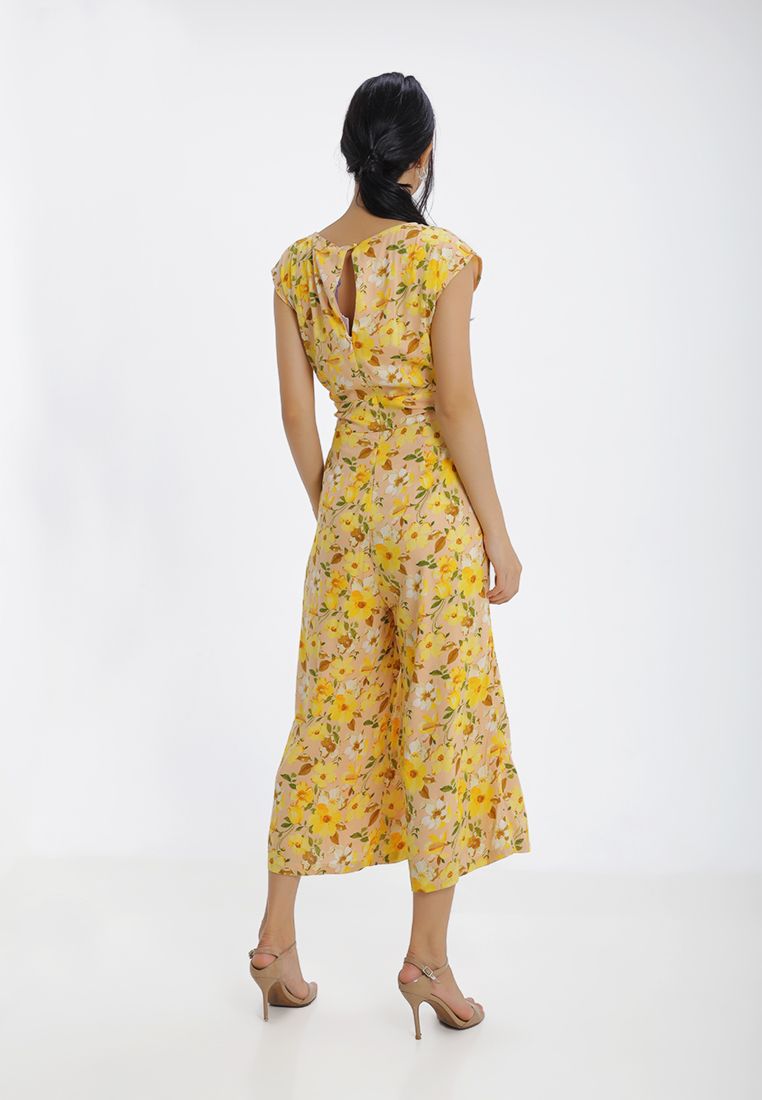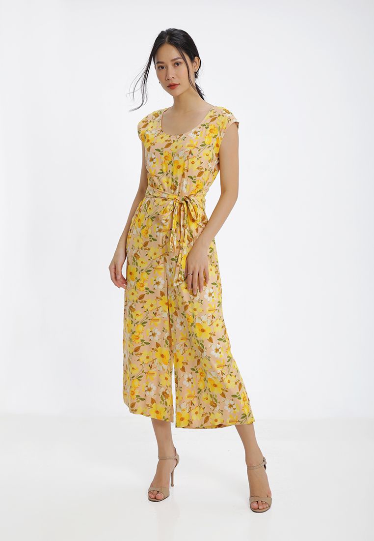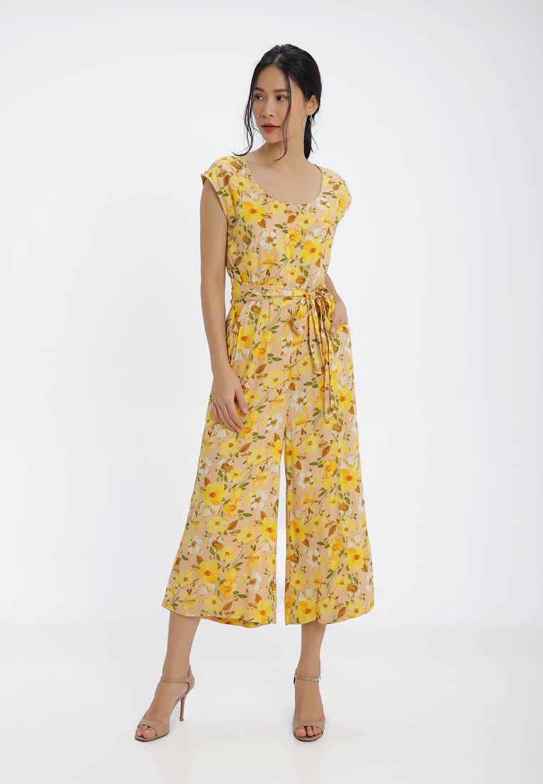 Jumpsuit họa tiết hoa lá nổi bật kết hợp buộc nơ eo sang trọng, thời trang.