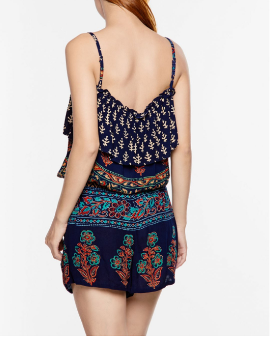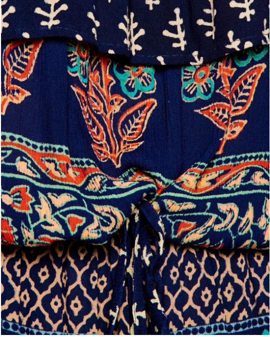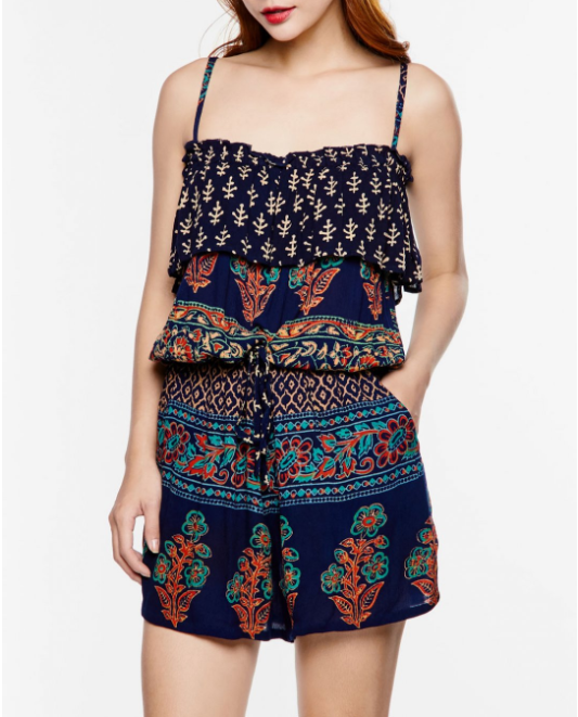 Jumpsuit bẹt vai họa tiết thổ cẩm trẻ trung, năng động, nữ tính.
