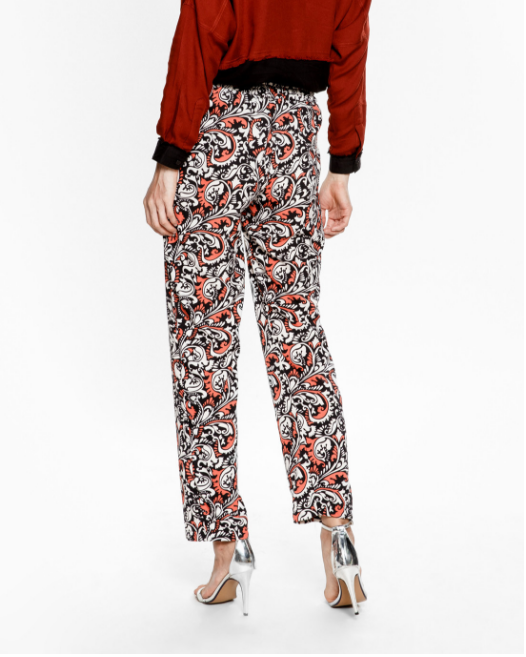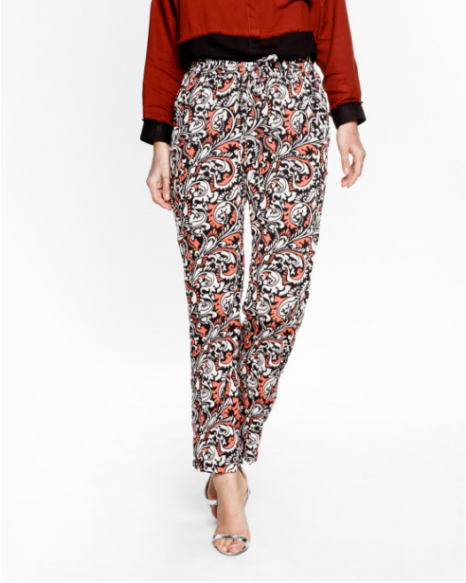 Quần dài học tiết hoa văn cách điệu form ống đứng, phù hợp nhiều dáng người.